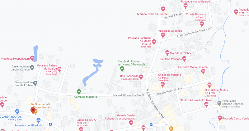 For those who are driving from the north on highway Br 101, like our Surf Camp,Guarda do Embau is situated inside the State Park of Serra do Tabuleiro; and to get there, you need to drive past the exit to Florianopolis city. 35 kms south(approximately 22 miles), to your left, you will see a sign to Praia do Sonho ( Dream Beach), you must be prepared to go to the hard shoulder to your right before crossing over the highway to get to the road that will take you to Praia do sonho, Pinheira and Guarda do Embau. to Guarda do Embau, When you reach Pinheira there will be a petrol station to your right, as you turn right into this road, further ahead you will see a sign to turn left to Guarda do Embaú, 100 yards down the road, on your left, there will be a dirty road called Rua Manoel Alfredo Pereira, (see map below), follow this road to the right, and on the third alleyway to your left, you will find our Surf Camp site sign by a black gate, just open it and there will be three gates to your right; the second one is the gate to our house, and it has a bell for people who wants to book accomodation or camp; the third gate, is the entrance gate to our Surf Camp .