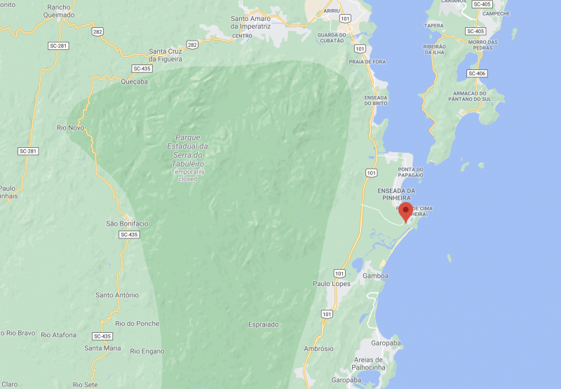 Para quem vem do norte descendo a Br 101: Nosso Surf Camp na Guarda do Embau como a própria Guarda do Embau é, situado dentro do Parque Estadual da Serra do Tabuleiro.